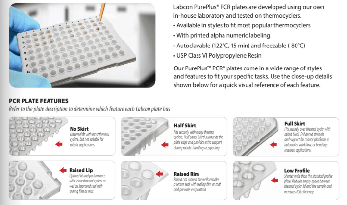 Labcon PurePlus® PCR plates are designed to fit many popular thermocyclers including brands like Applied Biosystems®, Eppendorf®, Thermo Scientific®, and Bio Rad®. All our PCR disposables are made from 100% virgin polypropylene and are lot tested and certified to be free of RNase, DNase, Endotoxin and ATP.
