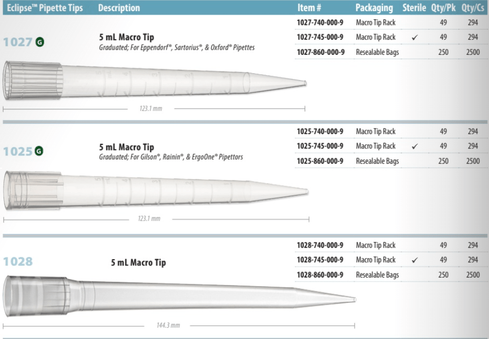 All Labcon Eclipse™ Pipet tips feature medical grade polypropylene resins that are U.S. FDA approved. Our macro Eclipse™ tips are no exception. Our sterile Eclipse™ macroTips are sterilized to an SAL of 10-6 so they can be used in medical and diagnostic applications in addition to research. Available in bulk versions or our unique composite racks to meet any laboratory needs.