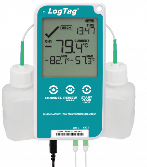 The LogTag® UTREL30-16 Dual-Channel Low Temperature Recorder measures and stores up to a total 32,000 temperature readings.