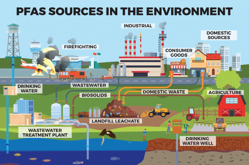 • Commercial household products, including stain- and water-repellent fabrics, nonstick products, polishes, waxes, paints, cleaning products, and fire-fighting foams (a major source of groundwater contamination at airports and military bases where firefighting training occurs).